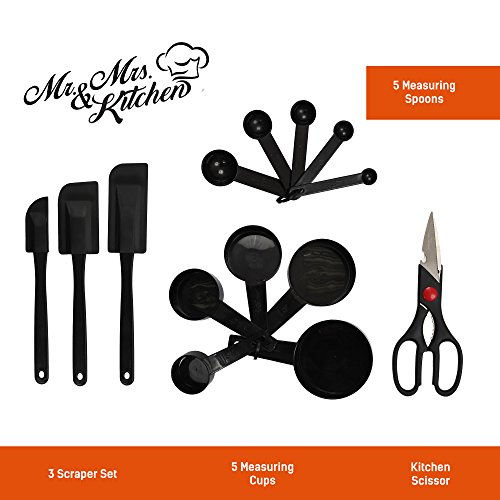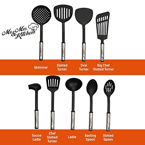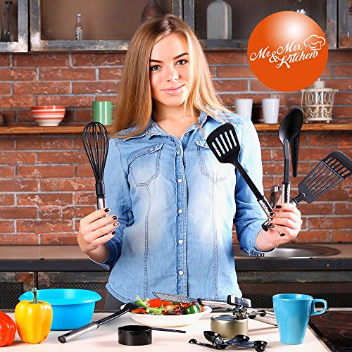 -. Feature : ✅ THE BIGGEST TOOL AND GADGET SET (39 PCS). Cooking utensil set: Basting Spoon, Slotted Spoon, Slotted Turner, Spaghetti Server, Ladle, Oval Turner, Skimmer, Turner, Sauce Ladle, Whisk, Potato Masher, Icing Knife, Fork, Meat Fork, Big Chef Slotted TurnerChef Slotted Turner, Cooking Tongs, Pizza Cutter, Bottle Opener, Cheese Grater, Garlic press, Can Opener, Peeler, Kitchen Scissor, Ice cream spoon, Pie server, 3 Scraper Set, 5 Measuring Cups, 5 Measuring Spoons. / ✅ EVERYTHING YOU COULD NEED IN THE KITCHEN! Any dish, every cooking process will become much easier and more interesting if you use kitchen cooking utensil set from Mr. & Mrs. Kitchen. You'll be able to cook everything - nothing is impossible. Cooking is so easy if you have all the necessary tools at hand. An ideal set for everyday use / ✅ MADE OF NYLON AND HIGH-QUALITY POLISHED STAINLESS STEEL. Materials used in the cooking utensil set are eco-friendly and safe for your health. The tools don't scratch dishes, but they cut, press, mix and do other things well - the highest-quality and most comfortable tools and gadgets to use. Cooking utensils for nonstick cookware set don't have any smell, are easy to clean, can't be stained with food, and withstand even high temperatures. / ✅ LONG USAGE PERIOD. The materials on every part are sturdy and durable, you'll be able to use set cooking utensils for more than one year. There's nothing more reliable than stainless steel and nothing more gentle for dishes than nylon. Durability, reliability and high quality are backed by a lifetime guarantee. / ✅ BEST GIFT FOR FAMILY AND FRIENDS. This is the best gift on any holiday. Give silicone kitchen utensil set new cooking kitchen nonstick set to your close friends. With such a stainless steel kitchen utensils cooking set, everyone will want to cook at home as a real chef. A beautiful, stylish, comfortable and multifunctional set that is necessary in every kitchen!