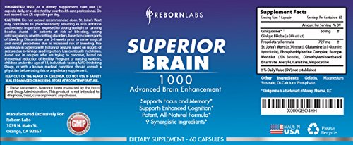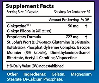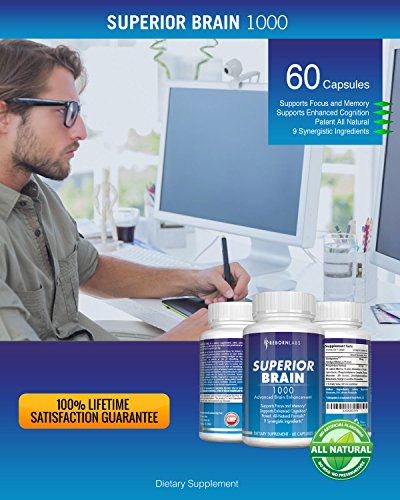 -. Feature : IMPROVES FOCUS, MEMORY, CLARITY & MOOD. Superior Brain contains a natural blend of brain boosters including Ginkgo Biloba, Acetyl L Carnitine, Bacopa, Vinpocetine & St Johns Wort. This effective formula helps to provide the nutrients your brain needs to operate at optimal levels.. / GINGKO BILOBA-BASED. Ginkgo biloba helps to naturally reduce brain fog and mental fatigue. The ingredients Gingko Biloba & Vinpocetine work synergistically to improve circulation of nutrients within the brain. This enhanced circulation may result in improved cognition. / IMPROVES MOOD AND HELPS REDUCE STRESS. St Johns Wort has been studied as a safe mood enhancer. When combined with other mood enhancers such as Acetyl L Carnitine (ALCAR), Ginkgo, and Vinpocetine, Superior Brain helps to maintain a state of well-being. / ESSENTIAL BRAIN VITAMINS. The brain supplements ginkgo, bacopa, and phosphatidylserine have been studied for their protective benefits . These brain vitamins function to help provide the aforementioned benefits and support brain health. / MADE IN A GMP-CERTIFIED FACILITY. High quality, purity, and potency.