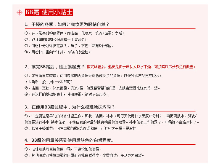 使用方法:1.基础洁肤后,按需出去适量本品均匀涂抹于额头、脸部、颈部,按自身肤感调节最佳妆容。2.无需另外使用隔离霜、粉底液或妆前乳便可以进行其他其他步骤的化妆程序。