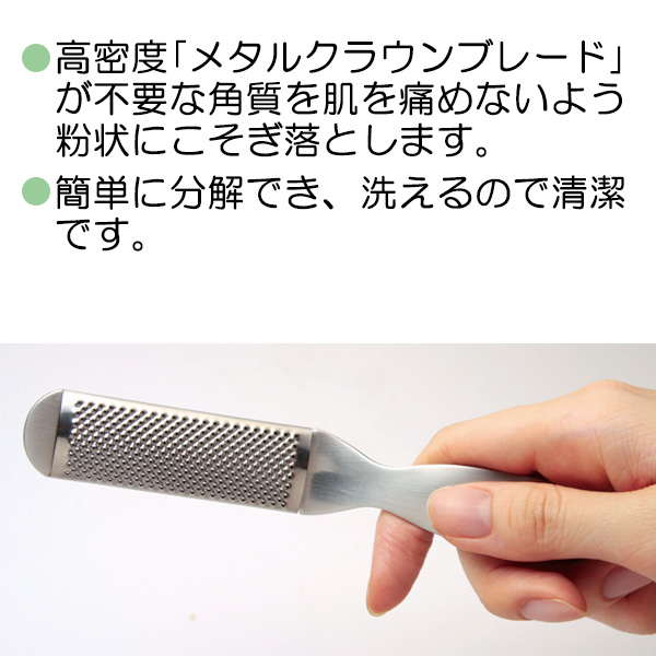 ●メタル・クラウン・ブレード採用・ギザギザ刃の「メタル・クラウン・ブレード」が不要な角質を粉状にこそぎ取ります。