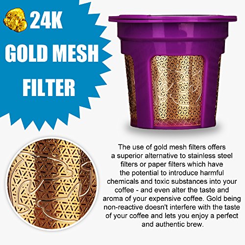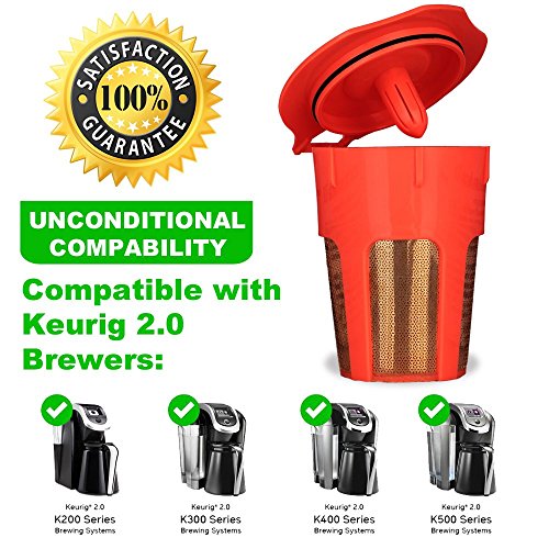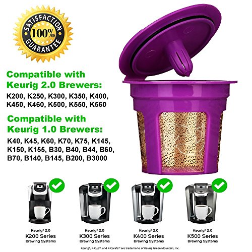 -. Feature : COMPATIBILITY - Our refillable k-cup is compatible with KEURIG 2.0: K200, K250, K300, K350, K400, K450, K460, K500, K550, K560; KEURIG 1.0: B30, B40, B44, B60, B70, B130, B140, B145, B150, B155, B200, B3000 and K40, K45, K60, K75, K150, K70, K145, K155, and the Keurig reusable k-carafe is compatible with KEURIG 2.0 - K200, K250, K300, K350, K400, K450, K460, K500, K550, K560 (NOT compatible with K475) / 24K GOLD MESH FILTER - The use of gold mesh filters offers a superior alternative to stainless steel filters or paper filters which have the potential to introduce harmful chemicals and toxic substances into your coffee - and even alter the taste and aroma of your expensive coffee. Gold being non-reactive doesn't interfere with the taste of your coffee and lets you enjoy a perfect and authentic brew. / ALL-IN-ONE KEURIG FILTERS COMBO - Our set of Keurig reusable k-cup and k-carafe filters eliminate the need to look for those cheap filters that require hacks like sticker or a freedom clip to be compatible with KEURIG systems. Moreover, our unconditionally compatible Keurig 2.0 filters come with a coffee scoop as FREE BONUS, thus, making it a perfect set of accessories for KEURIG systems. / SAFE, ECO-FRIENDLY AND ECONOMICAL - Our set of k-cup and k-carafe filters are made of 100% BPA Free and lead free materials to ensure that there isn't any adverse impact on your health. Moreover, the reusable filters eliminate the need to discard the filters after every use as is the case with paper filters and help reduce the environmental burden. Despite being gold filters, they turn out to be more cost effective in the long run when compared to disposable filters. / 100% RISK-FREE SATISFACTION GUARANTEE - We also offer you 100% risk-free satisfaction guarantee to let you buy with confidence; no questions asked. However, we are quite sure that these filters will help you brew incredible cups of coffee in a hassle-free manner, and you will love yourselves for the decision of buying this combo!