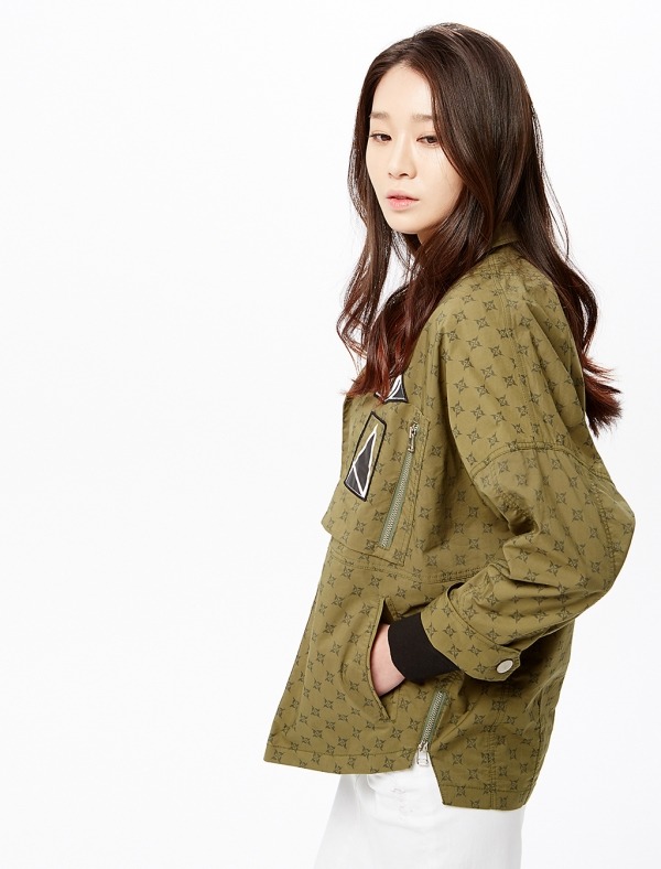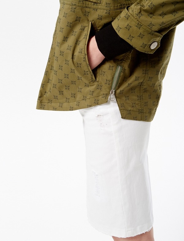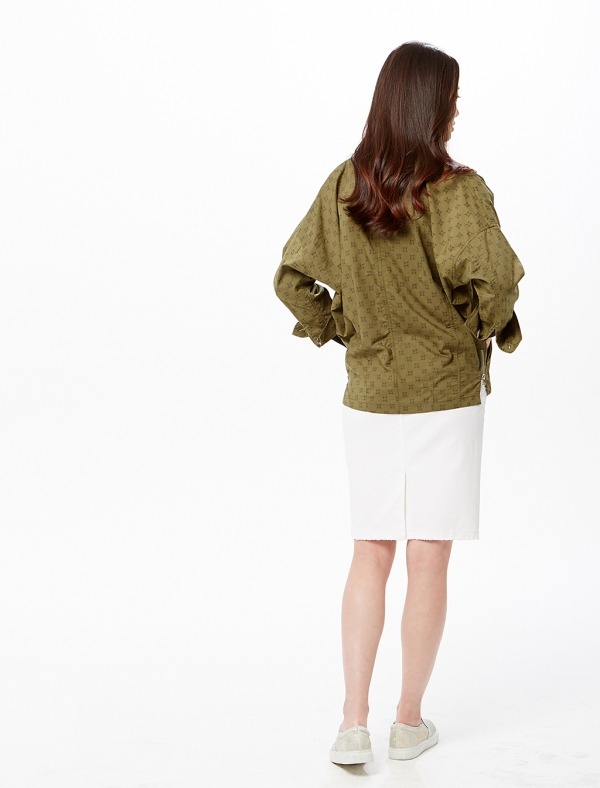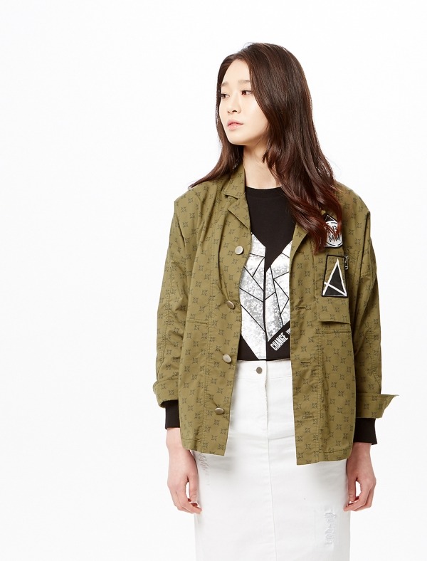 숏기장의 야상 스타일 점퍼입니다. 가오리 핏으로 볼륨감있는 실루엣이 특징이며 패턴있는 소재와 가슴부분에 패치 장식을 넣은 변형된 야상 점퍼입니다. 여성스러운 스커트와 로퍼를 매치해 신선한 스타일의 걸리시룩을 연출할 수 있습니다.