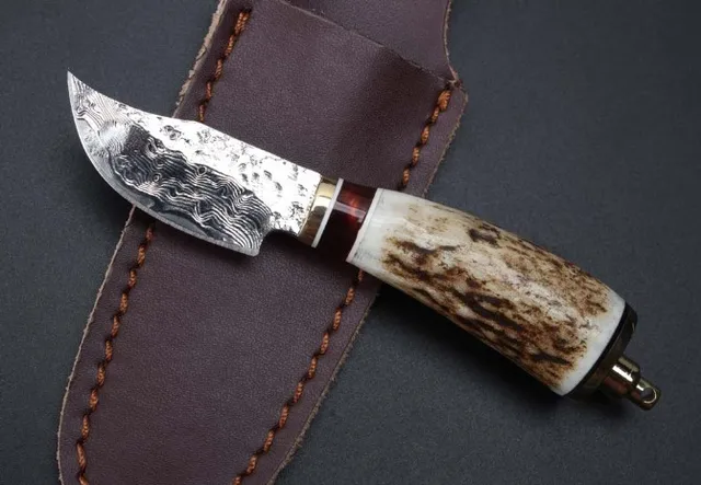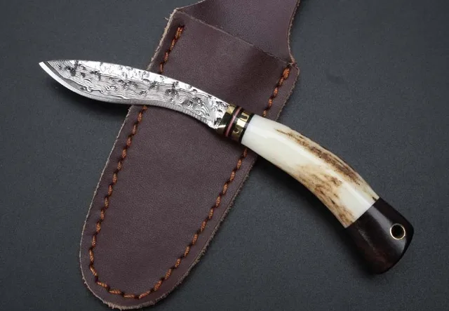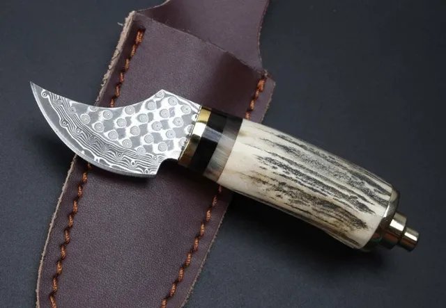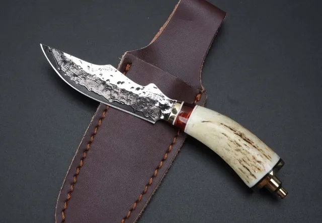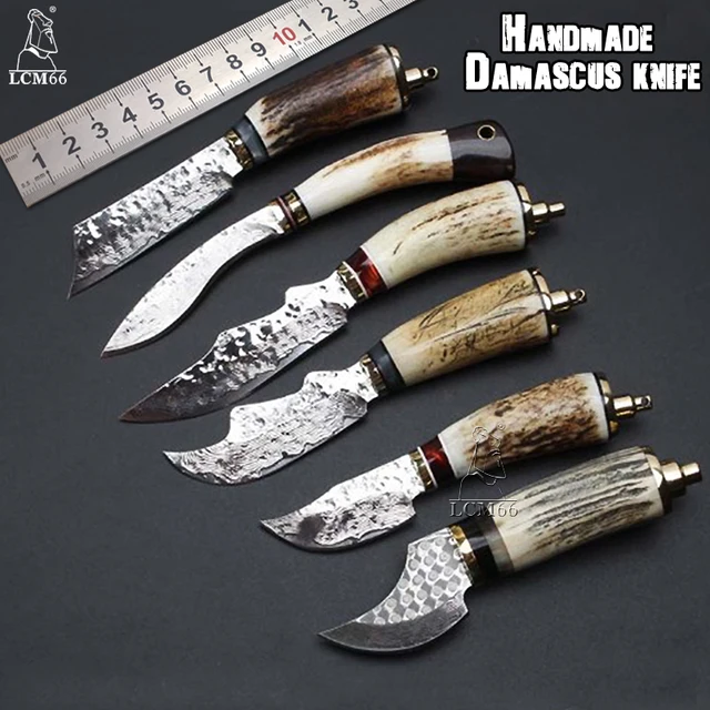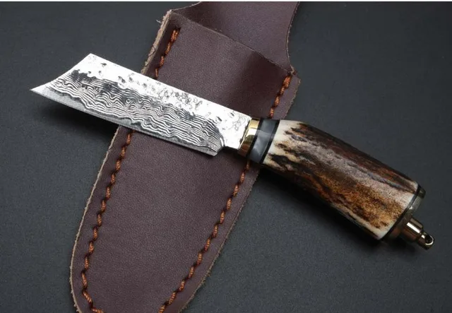 | [해외] LCM66 수제 단조 다마스커스 스틸 사냥 나이프 60HRC 다마스커스 스틸 고정 나이프 뿔 핸들 가죽 칼집 도구 |