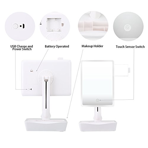 ♥SAVE MONEY AND SPACE: This lighted mirror is powered by included micro USB charging cord or 4AAA batteries(not included). When dual power supply, batteries won’t be consumed. Auto shut off after 15 minutes, in case no operations is being done. The Bottom base is a organizer,very sturdy and elegant,is ideal for holding cosmetics, jewelry, hair accessories and more.