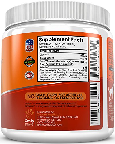 How Turmeric & Curcumin Helps Dogs Thrive - Our duck flavored chewable booster formula contains 400 mg of Organic Turmeric and 200 mg of Qmin+™ Curcumin, which contains 95% Curcuminoids to award your pet with anti-inflammatory properties that relieve discomfort associated with joint pain and arthritis, as well as protecting the digestive and immune system. It's the extra strength treatment they need to stay in great shape for years to come.
