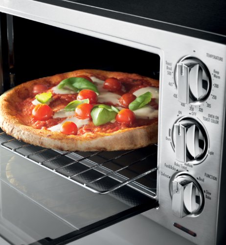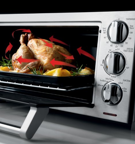 Works with fan-circulated hot air to distribute heat faster and more evenly, so food cooks 20 to 50-percent faster for a perfectly browned outside and moist, juicy inside;An ideal multi-function family oven with bake, bake with convection, defrost, broil, toast, slow bake and keep warm functions;Cooks two 12_Inch pizzas in extra large oven cavity;Cleanup is a breeze with the Durastone II interior; just wipe with a damp sponge;Control cooking program and temperature with the easy-to-use controls