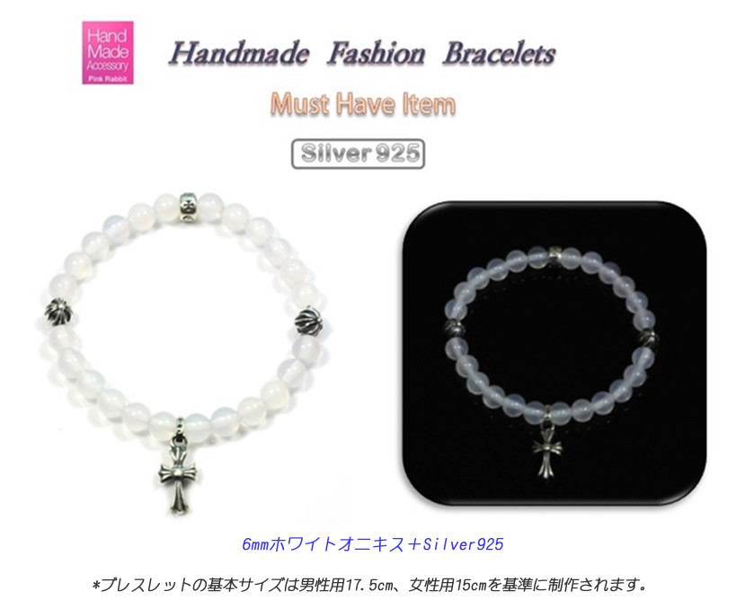 ***人との調和をサポートし「友情の石」とも呼ばれているホワイトオニキス*優しい色合いがナチュラルな印象のホワイトオニキスとクロスモチーフのシルバー装飾を合わせたお洒落なブレスレット☆デイリーに着けていたいお守りアイテム*:;;;:*☆*サイズ:ホワイトオニキスサイズ6mm、男性用17.5cm/女性用15cm*素材:ホワイトオニキス、925シルバー装飾*メーカー:ピンクラビット【シルバー製品メンテナンス方法】*使用後は柔らかい布等で乾拭きしていただくとよいです。*銀製品の性質上空気中に含まれる硫黄分と徐々に反応し変色が起こります。その場合は専用のシルバークリーナーや、クロス等で磨いていただくとキレイな状態に管理していただくことができます。