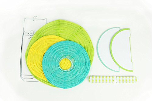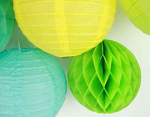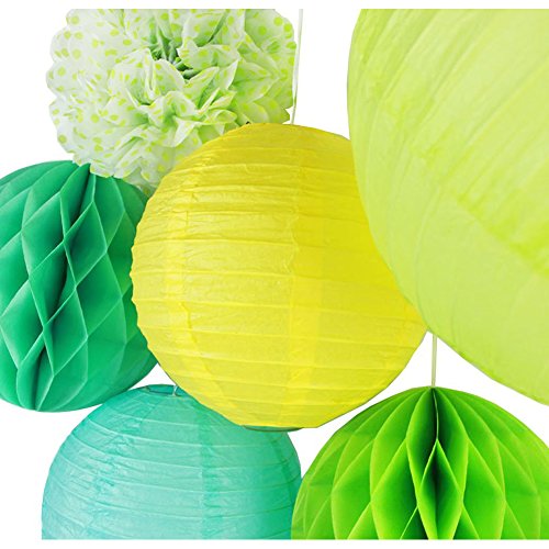 - Package included:1pc 30cm fruit green paper lantern,2pcs 20cm paper lanterns(aqua blue,yellow),2pcs 20cm paper honeycomb balls(mint green,light green), 1pc 20cm light green polka dot paper pom poms