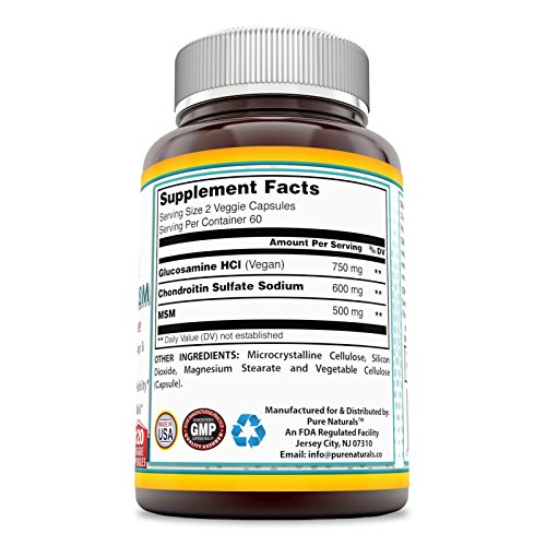 THREE ESSENTAIL JOUNT HEALTH COMPOUNDS IN ONE EFFECTIVE FORMULA Pure Naturals proprietary formula combines 750 mg of Glucosamine, 600 mg of Chondroitin and 500mg of MSM in a 2 capsule serving formula to support joint health and flexibility