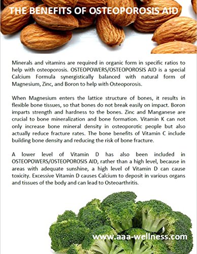 Osteoporosis Aid is a special Calcium formula synergistically balanced with Organic Magnesium, Zinc, Boron. Osteoporosis Aid contains vitamin K, C and small amount of vitamin D to prevent toxicity.