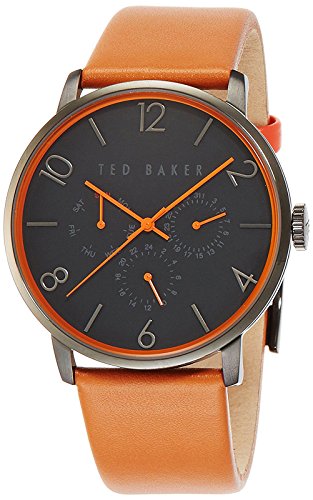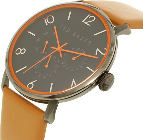 Finish your ensemble with the clean and minimalist style of this Ted Baker™ timepiece. Stainless steel case. Leather strap with buckle closure. Round face. Three-hand analog display with quartz movement. Dial features red pop-tone hands and bezel, muted hour markers, three sub-dials, and Ted Baker detailing. Water resistant 3 ATM. Comes with display box. Imported. Measurements: Case Height: 37 mm Case Width: 37 mm Case Depth: 5 mm Band Width: 9⁄16 in Band Circumference/Length: 9 1⁄4 in Weight: 1.8 oz This product may have a manufacturer's warranty. Please visit the manufacturer's website or contact us at warranty@support.zappos.com for full manufacturer warranty details.Feature