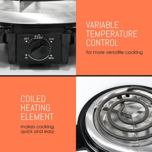 Cooking is quick, easy and consistent with the Elite Cuisine Single Coiled Burner. This portable electric hot plate offers reliable heating and takes up minimal cooking space. At 750 watts, it heats up quickly with low, medium and high temperature settings. It's perfect when you need an extra heat source for holiday cooking and entertaining, or simply use it to keep food warm at a buffet station.Feature
