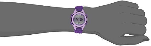 Round watch in dual purple tones featuring time, seconds, day/date, dual time, alarm, chronograph, countdown timer, and backlight with three-second delay