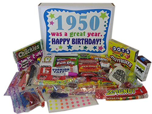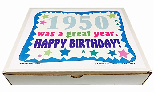-. Binding : Misc. -. Brand : Woodstock Candy -. Feature : 67th birthday box contains forty kinds of retro nostalgic candy / Remember the good old days with candy from your youth / Unique 67th birthday gift will bring back childhood memories / Makes a great conversation piece / Comes shrink wrapped -. Label : Woodstock Candy -. Manufacturer : Woodstock Candy -. PackageQuantity : 1 -. ProductGroup : Grocery -. ProductTypeName : GROCERY -. Publisher : Woodstock Candy -. Studio : Woodstock Candy -. Title : 67th Birthday Gift Box of Nostalgic Retro Candy from Childhood for a 67 Year Old Man or Woman Born in 1950