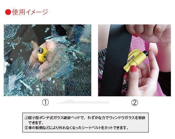 | 自動車での交通事故や水難事故の際に役立つ緊急脱出ツールです。シートベルト切り、ウインドガラス割りが付いたキーホルダー式。わずか18gと非常に軽量で小さいので、鍵につけて持ち歩いても気になりません。 |