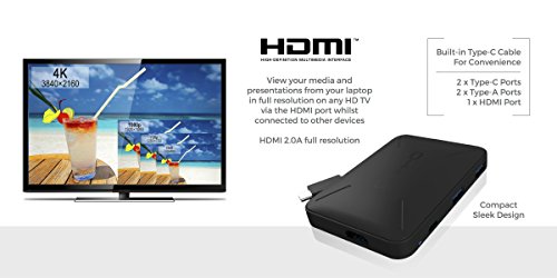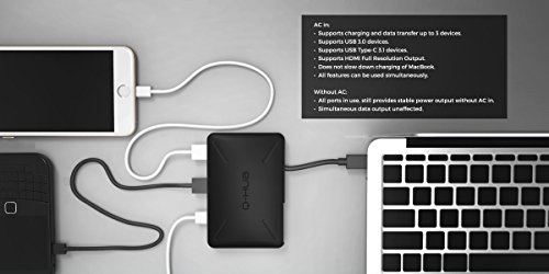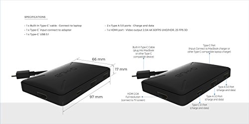-. Feature : Extends compatible Mac and Windows USB-C laptops with additional ports and power delivery (up to 60W) for USB peripherals - supports USB 3.1 data transfer speeds and USB PD profiles / Simultaneously connects three USB peripherals (2x USB-A, 1x USB-C) and 4K display (1x HDMI) to a USB-C laptop with USB SuperSpeed at 5Gbps / Connects to a USB-C power adapter and delivers power to USB-C laptop, e.g. MacBook, and charges all connected peripherals - maximum of 60W can be distributed among all connected devices / Displays to any external display with 4K UHD resolution (4096x2160 @60Hz) through the HDMI port / Easily carried in a bag at 2.6 oz and 3.8x2.7x0.6in (LxWxH)