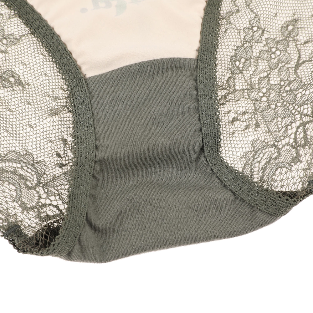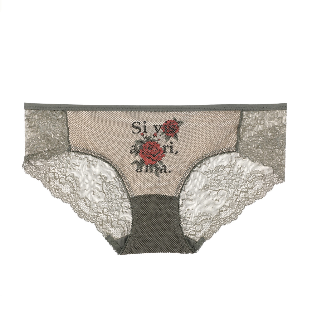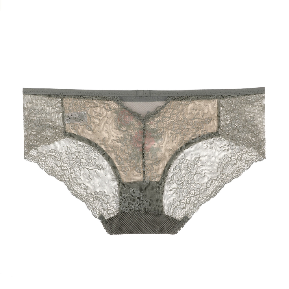 스킨 컬러 바탕에 장미 타투가 시스루하게 비춰 섹시한 분위기를 선사하는 카키 레이스 햄라인 팬티.