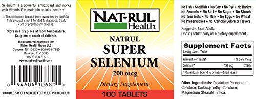 Studio : Nat-rul Health Publisher : Nat-rul Health Binding : Health and Beauty Product Description Selenium is a powerful antioxidant and works with Vitamin E to maintain cellular health.‡ ‡ This statement has not been evaluated by the FDA. This product is not intended to diagnose, treat, cure or prevent any disease. No Fish / Shellfish ? No Soy ? No Rye ? No Barley No Peanuts ? No Salt ? No Sugar ? No Starch No Tree Nuts ? No Milk ? No Eggs ? No Wheat No Preservatives ? No Artificial Colors or Flavors See label image for supplement facts 0