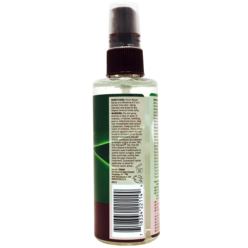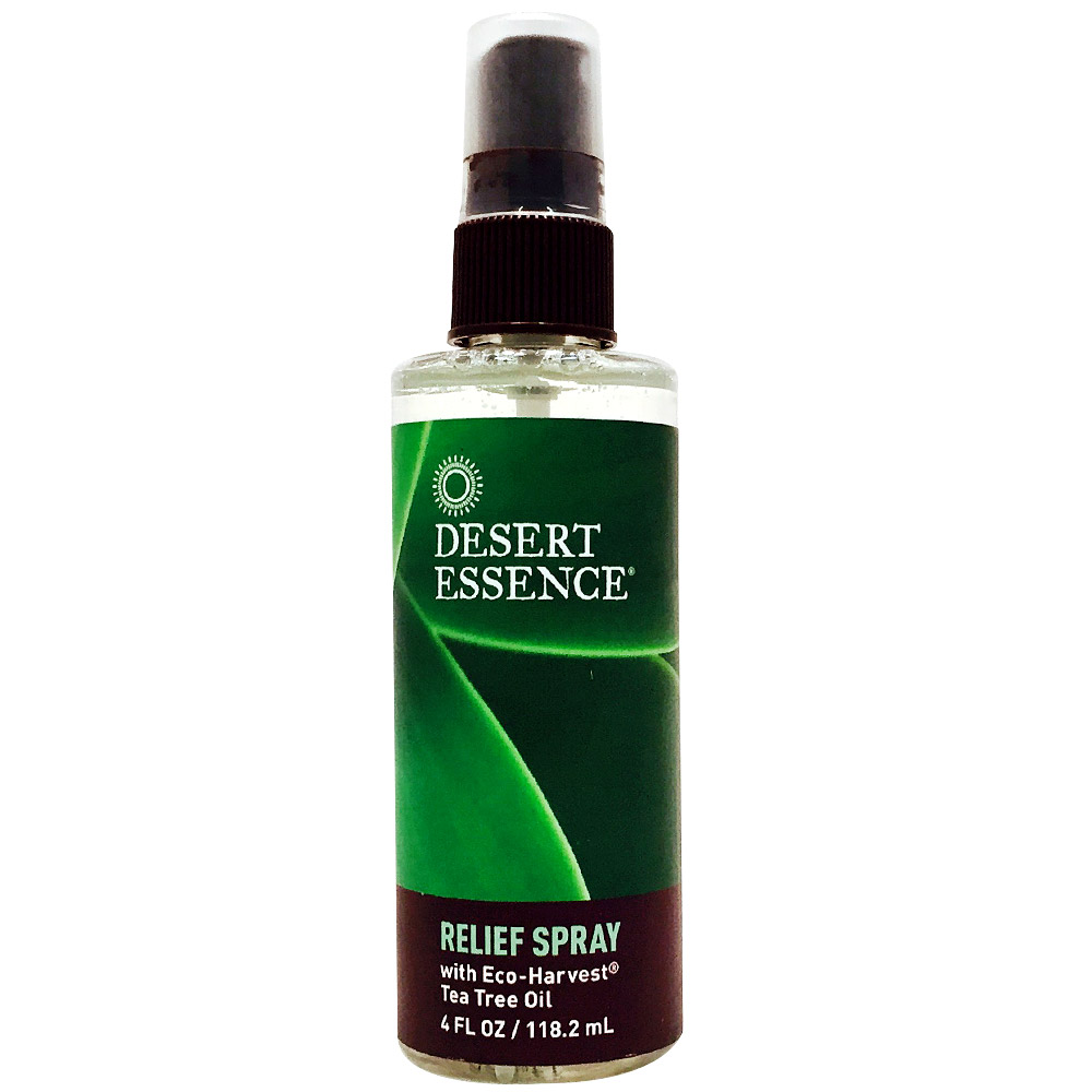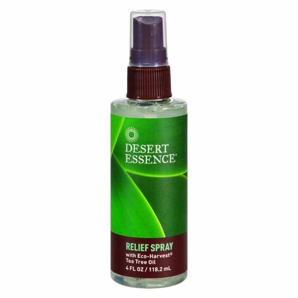 | Desert Essence Relief Spray Description: Soothes: Burns 100% Vegan DESERT ESSENCE RELIEF SPRAY combines the inherent antiseptic action of a 15% solution of Eco-Harvest Tea Tree Oil with a blend of essential oils used traditionally to soothe and reduce the symptoms associated with minor burns, scrapes, sunburn, insect bites and fungal infections of the feet. Ideal for post-manicure treatment. Convenient spray applicator is ideal for hard-to-reach areas.