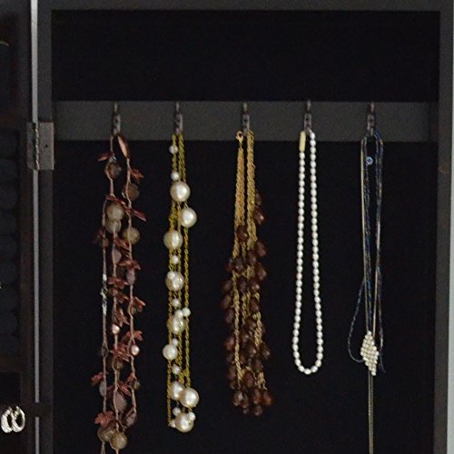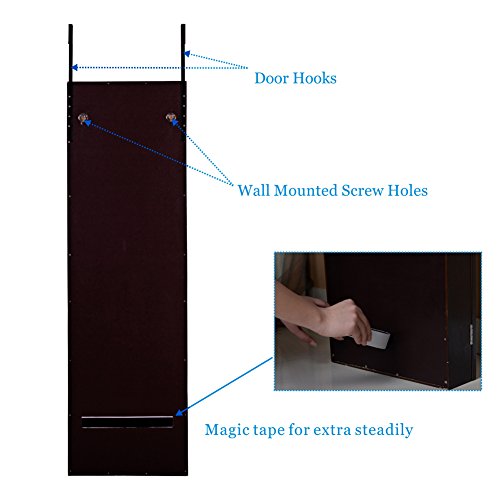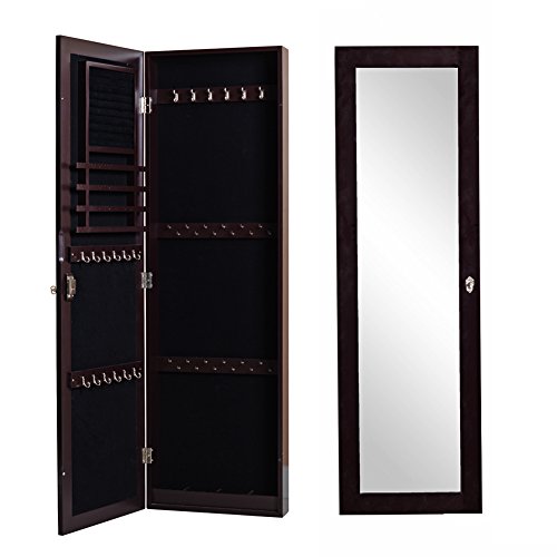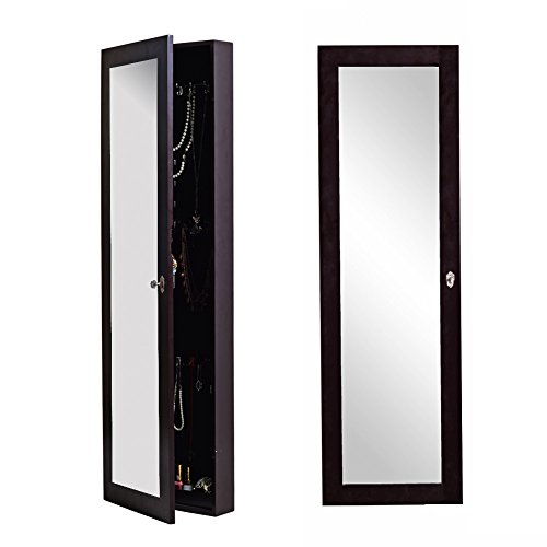 -. Feature : Save your home space,wall mount or hang over door,with hardware fittings and door hooks / Lots of divided space for your earings,necklaces,bracelets and your other beauty essentials,find them at your eyesight / Full length real glass mirror outside,convenient for your dressing and making up / Stores all of your jewelry safely with lock,black felt inner to protect your favorite jewelry pieces from scratches / Mirror dimensions:43.5'' X 10.2",cabinet dimensions:48"H x 14.6"W x 4.1"D