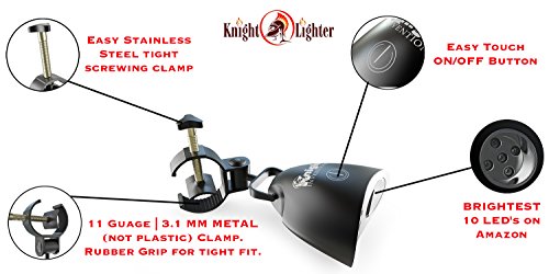 2018 UPDATED BRIGHTEST BARBECUE GRILL LIGHT - Your Knight Lighter grill light has a touch sensitive on/off switch for greasy hands that puts out over 120 Lumens and has 10 super bright LED lights that will illuminate over the entire surface. Brighter and more durable than ZEUST and TOMCARE. Constructed with military grade materials like durable Nylon Glass Fiber & 11 gauge (3.1mm) steel clamp (no cheap plastic) that can withstand light rains and extreme heat up to 365F.