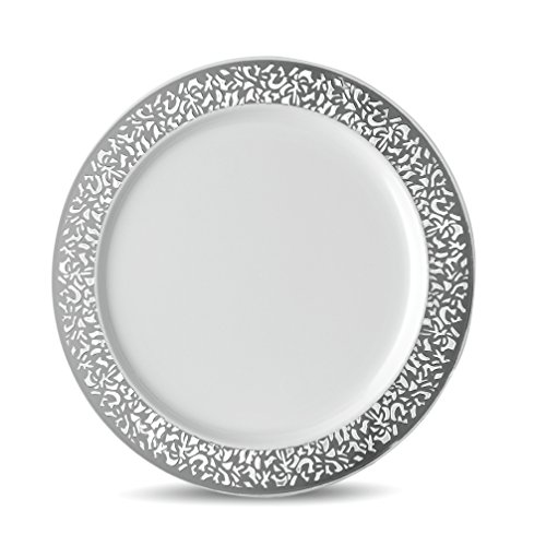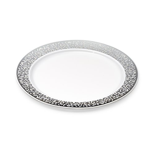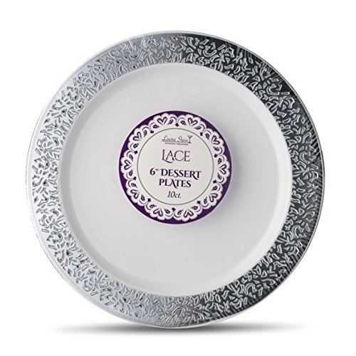 Laura Stein Designer Tableware Premium Heavyweight 6'' Inch White And Silver Rim Plastic Party & Wedding Plates Lace Series Disposable Dishes Pack of 40 Plates