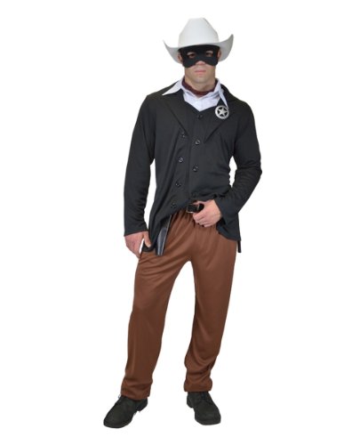 -. Feature : *Includes one piece jacket with attached vest and collar / *Stretch waist pants, mask, hat and holster belt / *Stretch polyester is comfortable and machine washable / *Officially licensed costume, Guns not included