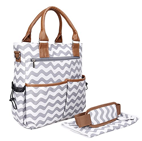 This stylish diaper bag has 7 best designed pockets and spacious storage space for baby items.Two large front pockets provide moms easy access to the items that are needed more frequently by your baby. One super large back pocket is for mom to carry IPAD, books, cellphone and keys.Two side pockets are insulated and designed to hold your baby's bottles and sippy cups.Three pockets inside the bag are of different sizes. The large ones are designed for diapers,wipes,bibs,changing clothes,swaddle blanket,and small pockets are perfect for sanitizer,tissues, sun creen cream etc. There is a zippered compartment to protect mom's personal items including wallets. This diaper bag has beautiful handles so you can carry it by hands or your arm.It also comes with removable shoulder straps that turns this bag into a crossbody/shoulder tote bag with no time.
