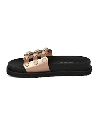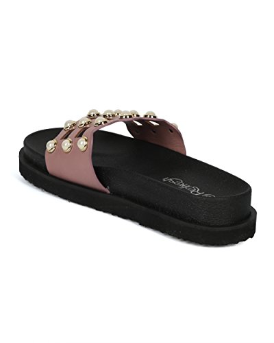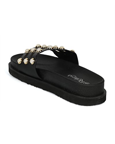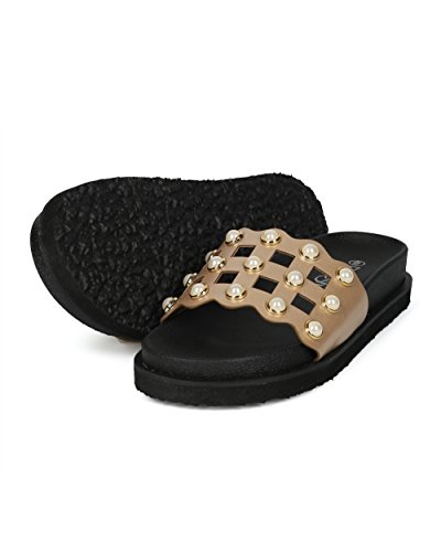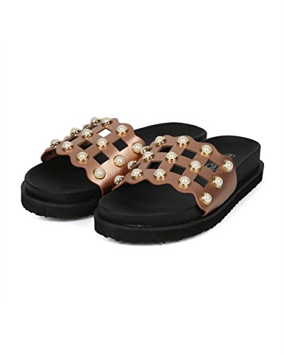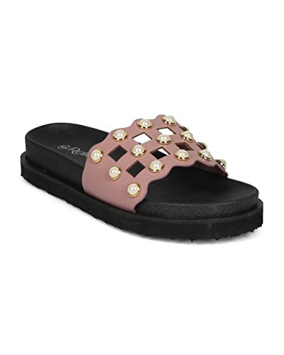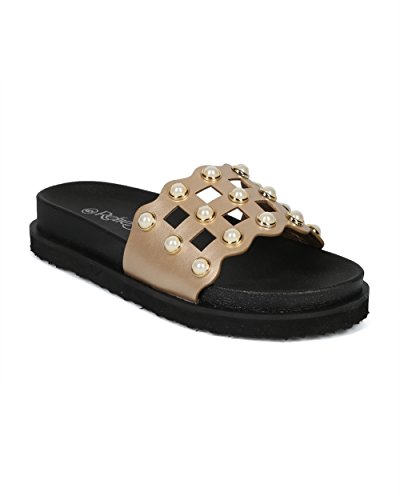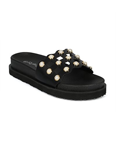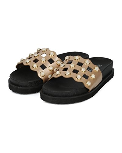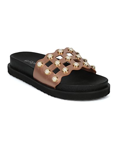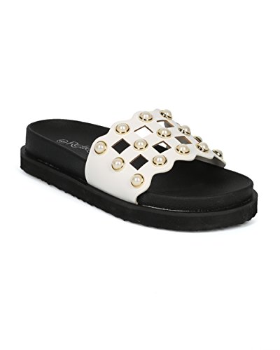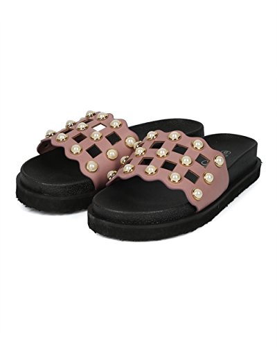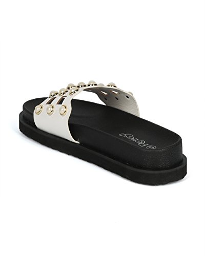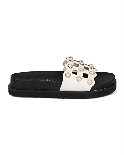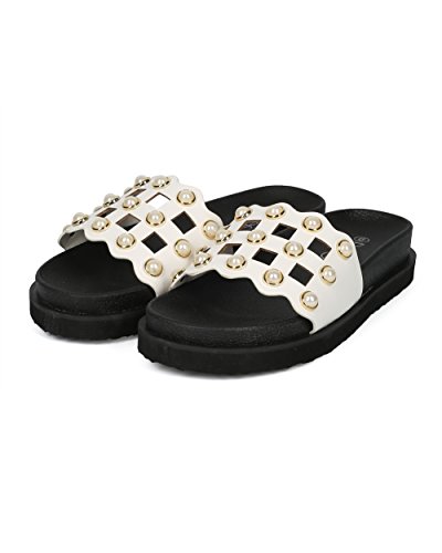 | (Alrisco)/Women's/Sandals/DIRECT FROM USA/Women Leatherette Faux Pearl Studded Caged Footbed Slide - HG31 by Refresh Collection |