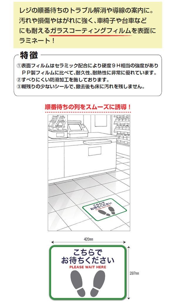| ガラスコーティングフィルムを表面にラミネートした、耐久性抜群のフロア誘導シールです。コンビニ・ドラッグストアなど、屋内の行列のできるあらゆる場所でお使いいただけます。長期に渡って使用感を感じさせず、店舗の美観を保てます(想定期間は通常使用で約2年の目安)。光沢があるタイプなので、視認性にも優れています。 |