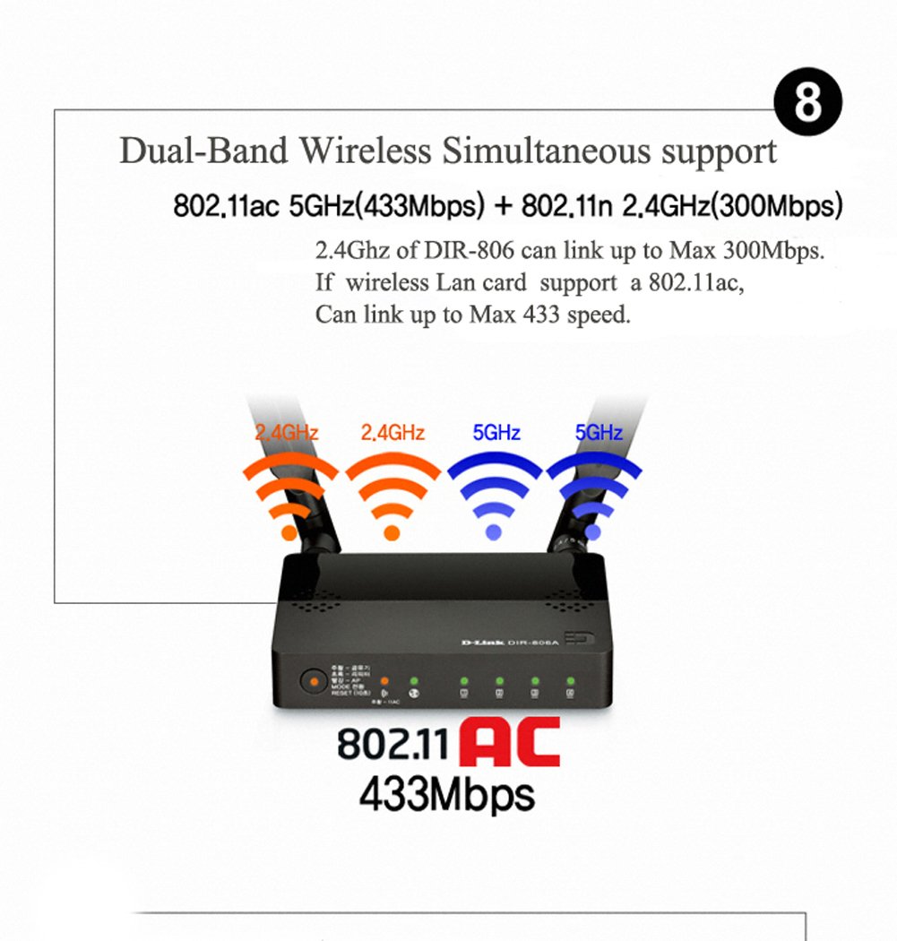 - DIR-806A has MAX 433 Mbps Wireless Link Speed. / Dual-Band Wireless Simultaneous support - 802.11ac 5Ghz(433Mbps) + 802.11n 2,4Ghz(300Mbps), 2.4 Ghz of DIR-806 can Link up to Max 300Mbps. If wireless Lan card support a 802.11ac, Can Link up to Max 433 speed.