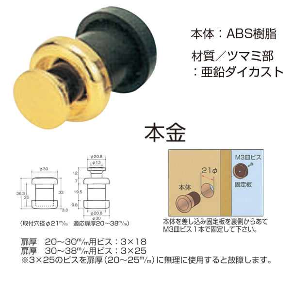 ●スペック:本体外径φ30mm 取付穴径φ21mm 適応扉厚20~38mm