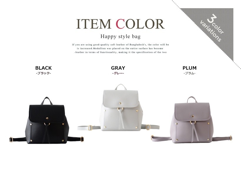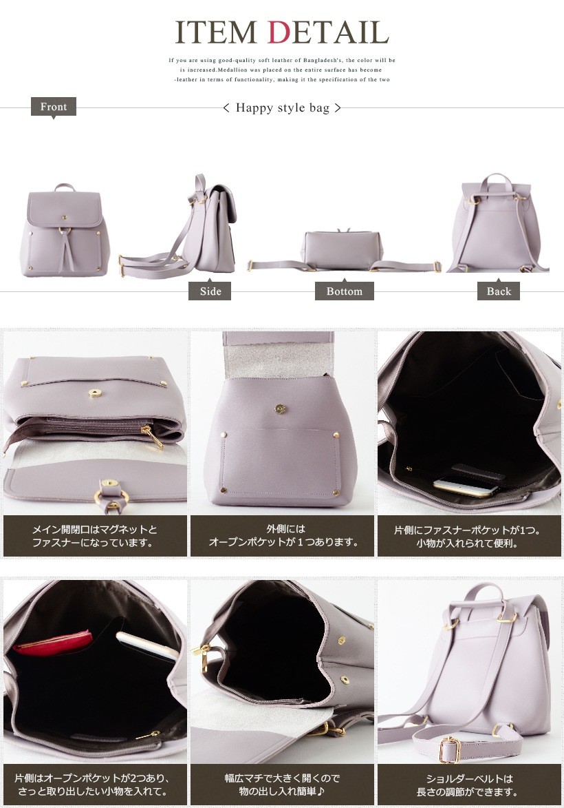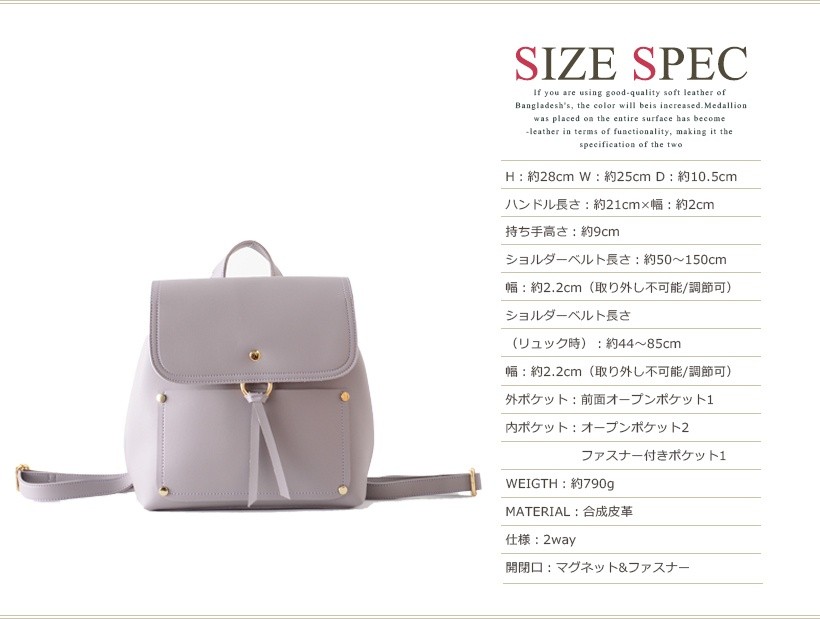 上品フォルムが魅せるオトナのリュックサック。オトナ女子にうれしいサイズ感とシンプルなデザインで、リュックに抵抗ある方にもオススメ。小さくてもしっかり収納力を備えた、実用的なリュックになっています。どんなコーデにも持ちやすく、幅広い年齢層に使っていただけます。●SIZE:高さ:約28cm / 幅:約25cm / マチ:約10.5cm●ハンドル長さ:約21cm×幅:約21cm、持ち手高さ:約9cm●ショルダーベルト長さ:約50~150cm×幅:約2.2cm(取り外し不可能/調節可)●ショルダーベルト長さ(リュック時):約44~85cm×幅:約2.2cm(取り外し不可能/調節可)●外ポケット:前面オープンポケット1●内ポケット:オープンポケット2、ファスナー付きポケット1●重さ:約790g●素材:合成皮革●仕様:2way●バッグのメイン開閉口はマグネット&ファスナーになっております。[カラー]ブラック・グレー・プラムメーカーより取り寄せ商品のため、在庫状況によっては欠品・廃盤の可能性があります。あらかじめご了承ください。