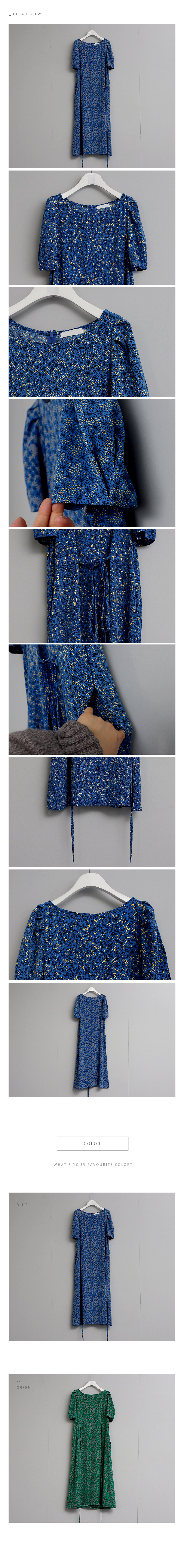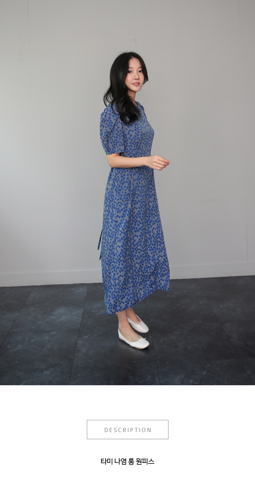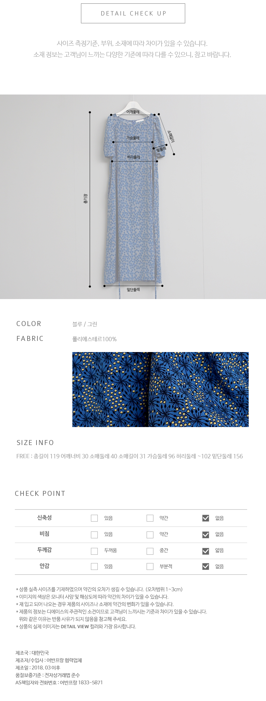 차르르 날리는 부드러운 폴리에스테르 소재와 컬러감이 돋보이는 잔잔한 나염이 시선을 끄는 여성스러운 패턴의 원피스에요 어깨선에서 연결되는 퍼프라인의 소매는 둥글게 반소매로 여성스러움을 더해주고 허리선에서 리본으로 사이즈에따라 묶어 강조하는 스타일로 밑단에서 A라인으로 퍼져 전체적인 라인이 너무 예쁘답니다 무릎을 덮는 롱한 길이감으로 차려입은듯 데이트룩, 하객룩으로 좋아요 색상은 블루, 그린 사이즈는 FREE 44~66반