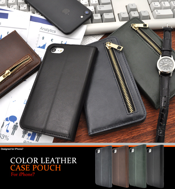 手触りのいいレザーデザインのiPhone7用チャック付きカラーレザーケースポーチ