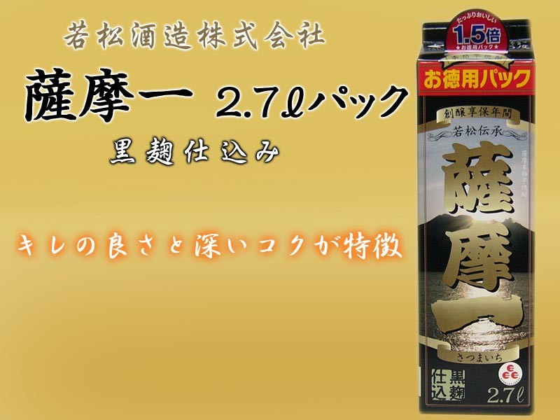 若松酒造株式会社  薩摩一 25度 パック 2700ml厳選された鹿児島県産「黄金千貫」を黒麹で丹念に仕込んだ味わいは、深いコクを持ちながら、キレのある飲み口を実現しています。また甘美で華やかな香りからは、薩摩の大地の恵みを感じます。酒類:芋焼酎メーカー : 若松酒造株式会社原材料:さつまいも・米麹麹:黒麹蒸留:常圧容量:2700mlアルコール分:25%