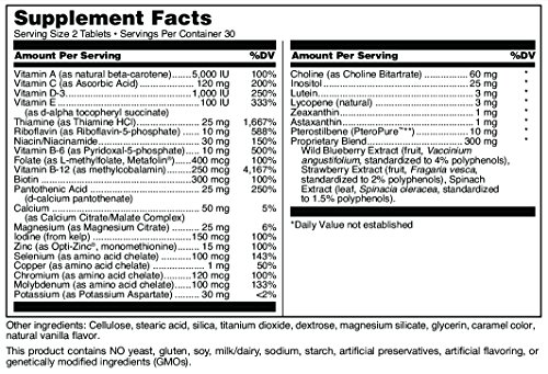Douglas Laboratories® is proud to introduce Ultra Preventive® 2-A-Day tablets with important vitamins and minerals plus powerful antioxidant support from a proprietary phytonutrient blend of standardized spinach, blueberry and strawberry extracts, carotenoids, and methylated resveratrol in just 2 easy-to-swallow tablets daily. Astaxanthin is included as the most powerful carotenoid antioxidant for healthy aging and inflammatory support. Activated forms of B vitamins in Ultra Preventive® 2-A-Day ensure proper utilization of vitamins.Feature