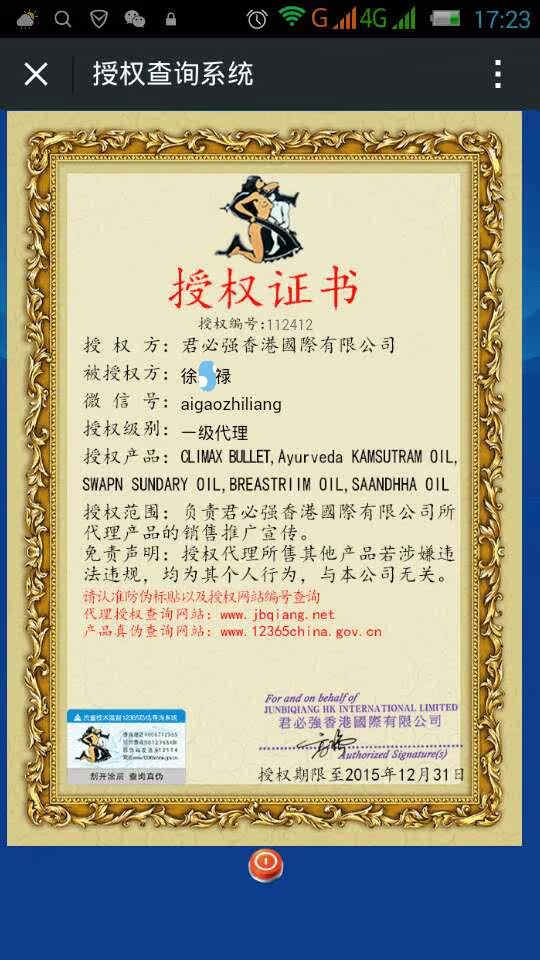 印度神油新品皇帝精油,全进口男性高端保健品。有增大,增硬,增粗,可以治疗阳痿,早泄等功效,外用按摩,纯中药成分,不麻木,维持快感。国内唯一授权公司君必强国际贸易公司原装进口正品,有防伪码验证真伪,现在市面上有很多几十元的同款产品,产品图片都一抹一样,说的也是印度进口货,小作坊的能和正规公司的比较么。我只能说一份价钱一分货,我们为什么能卖这么贵,因为我们是正品,是印度神油公司独家授权。自己命根子上用的东西能用廉价货吗,您敢用,我们可不敢卖。我们的产品经得起考验,经得起真伪辨别,我们公司的这款产品都有国家质量技术监督12365的防伪码,有GMP认证亲们可以看产品实拍