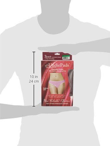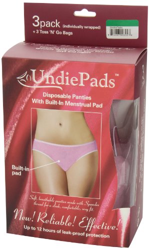 Studio : IlaNic Sanitary Products Publisher : IlaNic Sanitary Products Binding : Health and Beauty Product Description Disposable Period Panties with a unique built-in menstrual pad (3ct) and 3 Toss 'n' Go disposal bags. The First and Only leak-proof, worry-free period underwear. Up to 12 hour protection day or night. Soft, breathable fabric, made with special Spandex thread for maximum comfort and secure fit. Attractive style and soft elastic looks and feels like regular panties. Never ruin another pair of your panties again. UndiePads provide ultimate menstrual protection and are extremely convenient. Unlike other period panties that require washing after each use, these you just wear and toss away, it’s that easy! Available in size S, M and L/XL 0