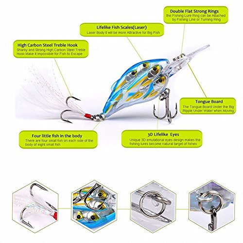 -. Brand : Smartcoco -. Feature : Durable ABS construction make it rigged with sharp treble hooks which makes it a powerful catching tool / Brilliant colors and realistic crankbait with lifelike bait fish swimming action to attract fishes which can be used in both saltwater and freshwater / With multiple fishes profiles on the body surface, this bait simulates a small cluster of fishes which is more easily to attract big fish / With steel ball inside,Control barycenter easily, crank baits more easily to be sensed / Comes with 2 quality treble hooks as well as with white feather tails, fish difficult to decouple -. Label : Smartcoco -. Manufacturer : Smartcoco -. MPN : STF-BY0272 -. PartNumber : STF-BY0272 -. ProductGroup : Sports -. ProductTypeName : OUTDOOR_RECREATION_PRODUCT -. Publisher : Smartcoco -. Studio : Smartcoco -. Title : Smartcoco 8cm/9.38g Jerkbait Crankbait Ball Fishing Lures Fishing Bass Bait Lures Hard Plastic Artificial Bait 4# Fishing Tackle