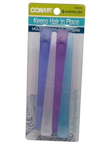 -. Binding : Misc. -. Brand : Conair -. Feature : EASY SECTIONING: Sectioning clips for sectioning and separating hair. / NON-SLIP: Grip ensures no slipping while working with wet hair, product or coloring. / GREAT FOR STYLING: Great to use when straightening or curling hair by sections. / ATTRACTIVE COLORS: Look good, even with clips in your hair. / BPA FREE PLASTIC: For healthy styling. -. Label : Conair -. Manufacturer : Conair -. ProductGroup : Beauty -. ProductTypeName : BEAUTY -. Publisher : Conair -. Studio : Conair -. Title : Conair Stylish Essentials 4 Sectioning Clips 4-count, Assorted Colors