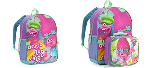 -. Feature : 16" Two-piece set: backpack and matching lunchbox / Your little girl will love this backpack and matching lunch box set. Constructed with two compartments, one large and one small, this backpack is capable of fitting all of her personal items and school supplies. The front graphic of various Trolls characters is sure to brighten her day. In the smaller pocket she can store her pencil box or small notepad. The larger compartment is big enough to fit her homework folder or spare jacket. / Now she can take her lunch to school in style with the coordinating lunch tote. This super cute and trendy backpack also has two side open-top pockets made of elasticized mesh, perfect for holding a water bottle or umbrella. The shoulder straps are padded and adjustable for comfort and security. She'll love to show this pack to all her friends when she heads back to school this year.