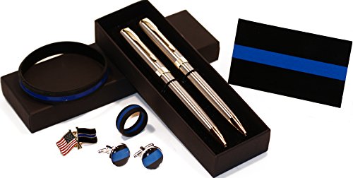 -. Binding : Office Product -. Brand : Beall's Bay -. EAN : 0724999170703 -. Feature : (2) Attractive Stainless Steel Pens w/Gold Trim Accents in Black Ink Cartridges / (1) Pair of Thin Blue Line Cufflinks / (1) Very Popular Size 10/11 Silicone Thin Blue Line Men's Ring / (1) American Flag to Thin Blue Line Flag Lapel Pin / (1) 3" by 2" Thin Blue Line All Weather Decal and (1) Silicone Blue Line Wrist Band -. Label : Beall's Bay -. Manufacturer : Beall's Bay -. MPN : THYII200 -. PartNumber : THYII200 -. ProductGroup : Office Product -. ProductTypeName : WRITING_INSTRUMENT -. Publisher : Beall's Bay -. Studio : Beall's Bay -. Title : Stainless Steel/Gold Police Detective Pens with Thin Blue Line Gift Pack -. UPC : 724999170703