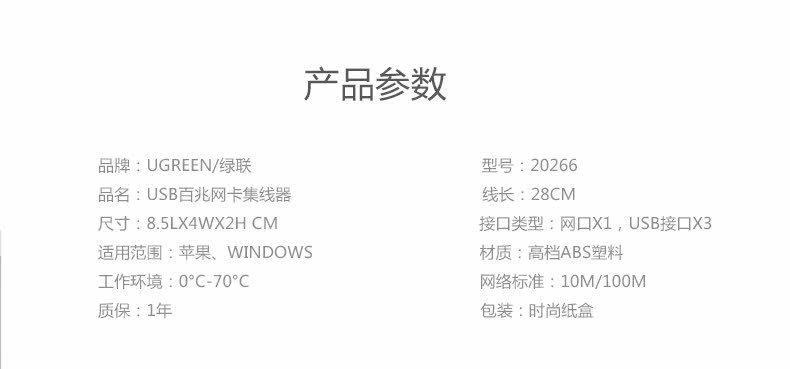 lvBrand: Green UnionModel: 20266Condition: NewAre Wireless: WiredNIC jack: USBTransmission speed: 100MbpsApplicable network type: Fast Ethernet