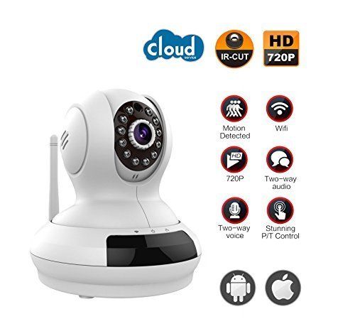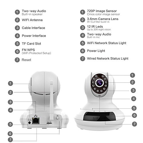 -. Feature : •1.H.264 video compression;Support IE, Chrome, Firefox, Safari, Opera, etc. ;High Definition 1280*720,clear image;P2P technology , plug and play : no any settings; Smart transmission technology: adaptive bandwidth, dynamic code rate adjustment, voice first, the jitter buffer; / •2.Support two-way audio, telecommunication level of signal processing, (echo cancellation, noise suppression, comfort noise, silence suppression);Support Android /iOS system mobile devices, remote real-time monitoring(25 fps image transmission, 720P HD images);Support multiple platforms, terminals, networks;Support remote firmware upgrade; / •3.Support multiple-users access ,multiple users management;Motion detection, real-time App push notifications;12 pcs infrared LEDs, night vision distance: 10 meters, 24 hours day and night monitoring, IR-CUT switch;Support micro SD card (max 32 GB) storage,Cloud box local recorde and cloud storage; / •4.Support WIFI (IEEE802.11 b/g/n);Support QR code login;Support Pan and Tilt (level: 350¡ã & vertical: 100 ¡ã);Support WPS one key Wi-Fi configuration; / •5.In Stock, best service, fast shipping time