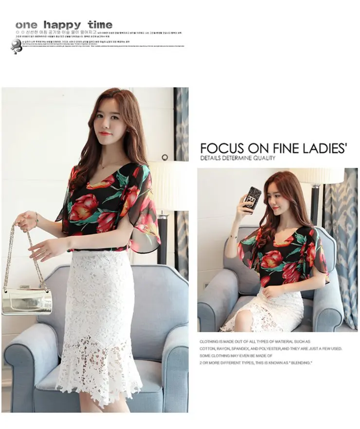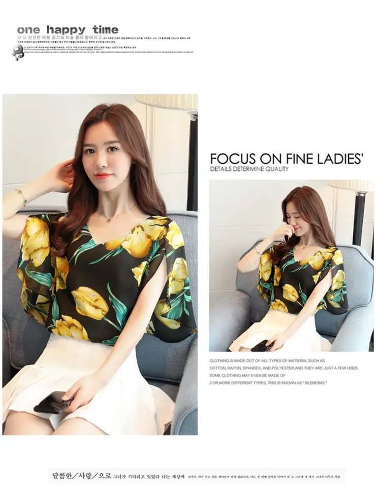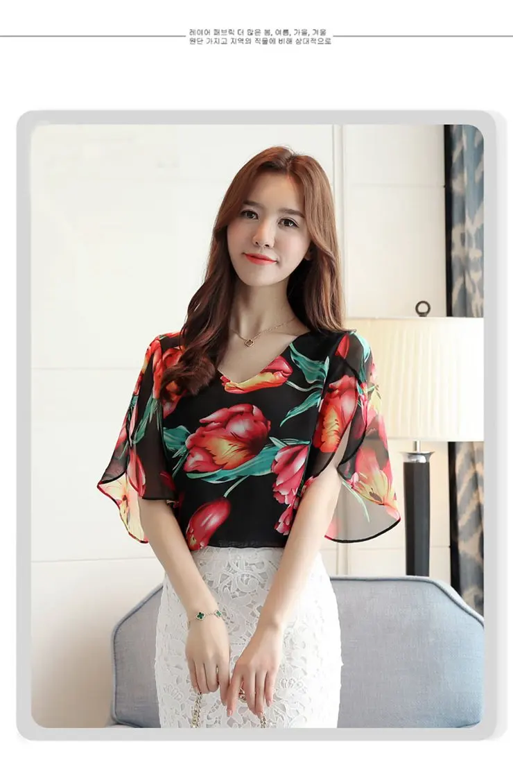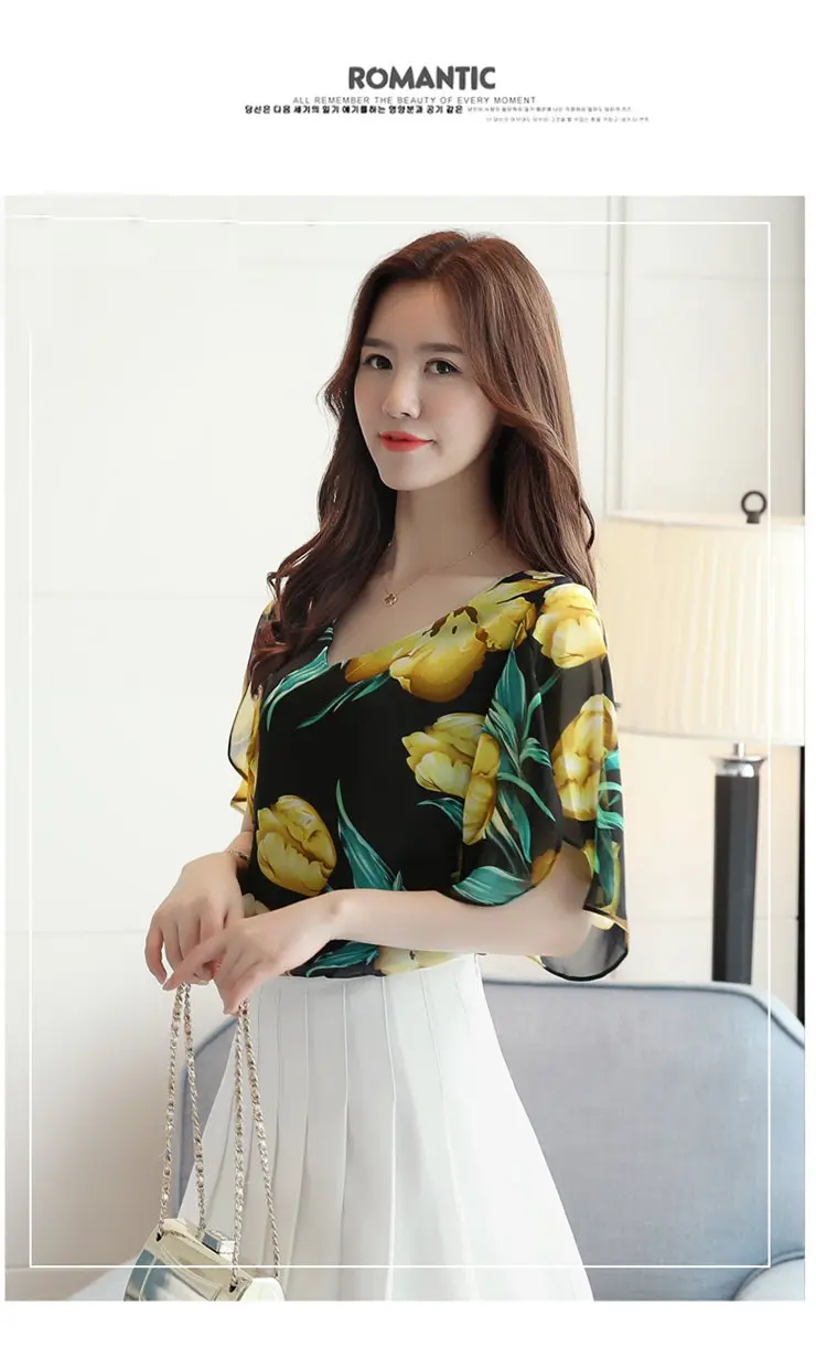 Blusa Feminina:Elegant Petal Sleeve Shirts Plus Size Floral Estampado Blusas Femme