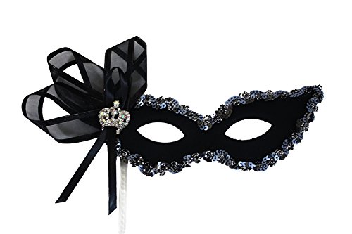 We have chosen two complimentary masks from our collection to make a "COUPLE". The price is for two masks. Sylvia is a matte black elegant mask that is edged with a sequin braid and has an accent of silver mesh ribbon a a beautiful rhinestone crown brooch. It comes on a 10 inch sturdy clear stick. The match a sharp looking Black Verona mask. It secures with an elastic band. Each mask is hand-decorated in the U.S.A. by our talented artists.Feature