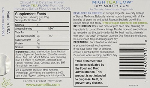 -. Binding : Health and Beauty -. Brand : MighTeaFlow -. Feature : Made with new Permeate Technology and Xylitol. / Helps reduce bacteria that flourish in a dry mouth, causing plaque and tooth decay. / Helps relieve mouth dryness without side effects with all the benefits of green tea and Xylitol / Helps relieve the feeling of having sandy peanut butter in your mouth, so you can rest better at night. / Naturally stimulates salivary flow. -. Label : Camellix -. Manufacturer : Camellix -. ProductGroup : Health and Beauty -. ProductTypeName : HEALTH_PERSONAL_CARE -. Publisher : Camellix -. Studio : Camellix -. Title : MighTeaFlow Spearmint Dry Mouth Chewing Gum