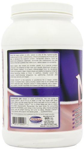 Studio : Syntrax Publisher : Syntrax Binding : Health and Beauty Product Description Being the major protein in milk, casein is one of the highest quality proteins known to man. Unfortunately, inferior processing techniques can alter or denature this superior protein. Denatured caseins, such as sodium and potassium caseinate dominate the marketplace but are devoid of the best qualities that make pure, native casein so wonderful.Native casein, also known as micellar casein, is a special product produced in the absence of high heat and caustic chemicals through a gentle filtration method. It is easily differentiated from its denatured cousin by its superior, clean, creamy taste and ability to disperse instantly without becoming chalky or thick. In addition, micellar casein has superior, health-inducing properties by optimizing muscular and whole-body recovery and repair.Micellar Creme is the epitome of excellence for a casein protein product. It contains fresh, native micellar casein that is not tainted with inferior caseinate salts. Miceller Creme mixes instantly with a spoon, has a creamy, smooth mouth feel and tastes just like a real milkshake. 0