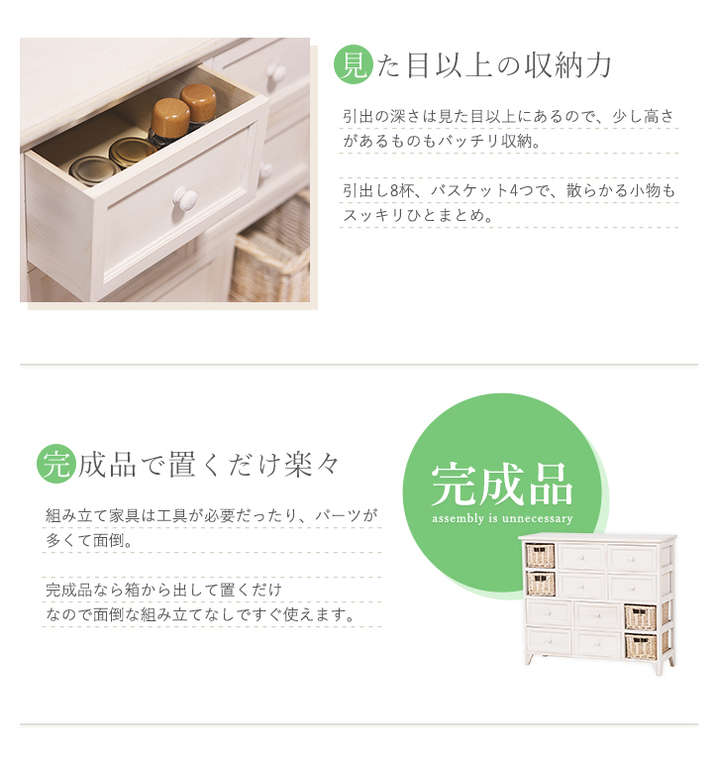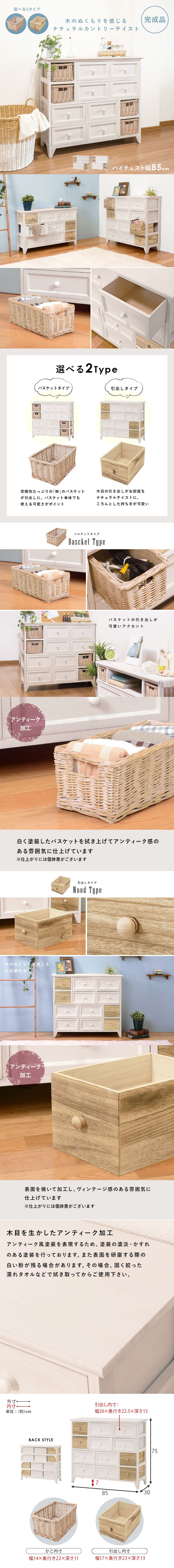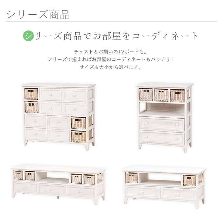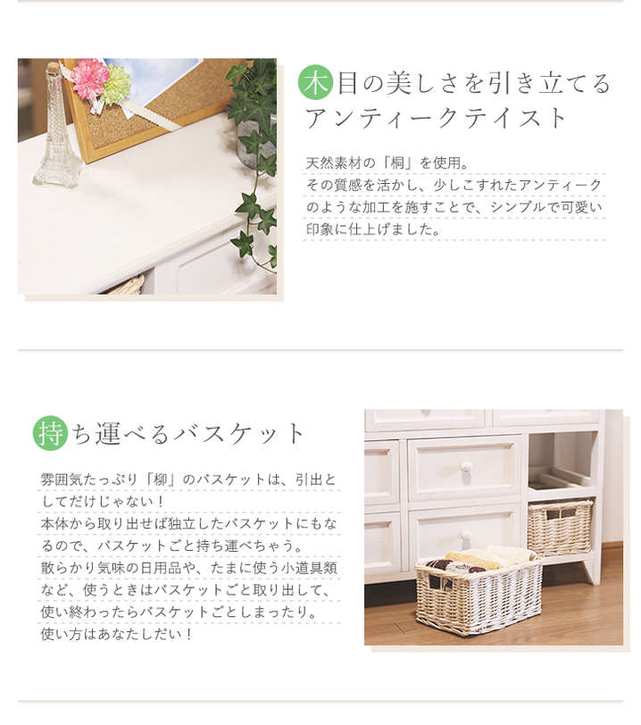 ●たっぷり収納できる、シンプルなアンティーク調チェスト。柳のカゴがアクセント。